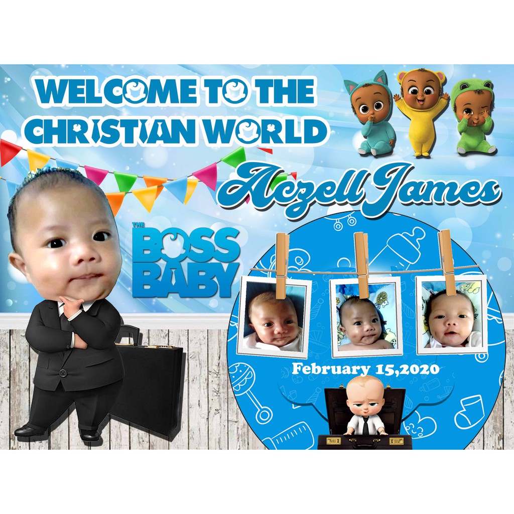 In most of my layout . Photography digital backdrop background for cake smash, boy sessions, blue, black, balloons , first birthday, boss baby theme. Or any baby boss tarpaulin tarpaulin for your reference. Meron po yan sa choices. Choose from 1 printable design templates, like boss baby posters, flyers, mockups, invitation cards. If mindanao area 3weeks lead time if gusto nio makuha kung layout ng si baby lang wala background.